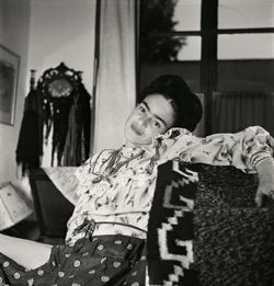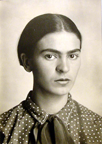 The images her photographer father made of his daughter as an adolescent show her in her search of an identity, trying out the many guises she would appropriate and discard throughout her lifetime. What she is wearing in these photographs is an indication of the changes within. In some she appears in men’s clothing, a nod to her sexual ambivalence, and in all of them she looks very serious. As if she was following the maxim she professed after her accident, “I knew a battlefield of suffering was in my eyes. From then on I started looking straight at the lens, unflinching, unsmiling, determined to show I was a good fighter to the end.”